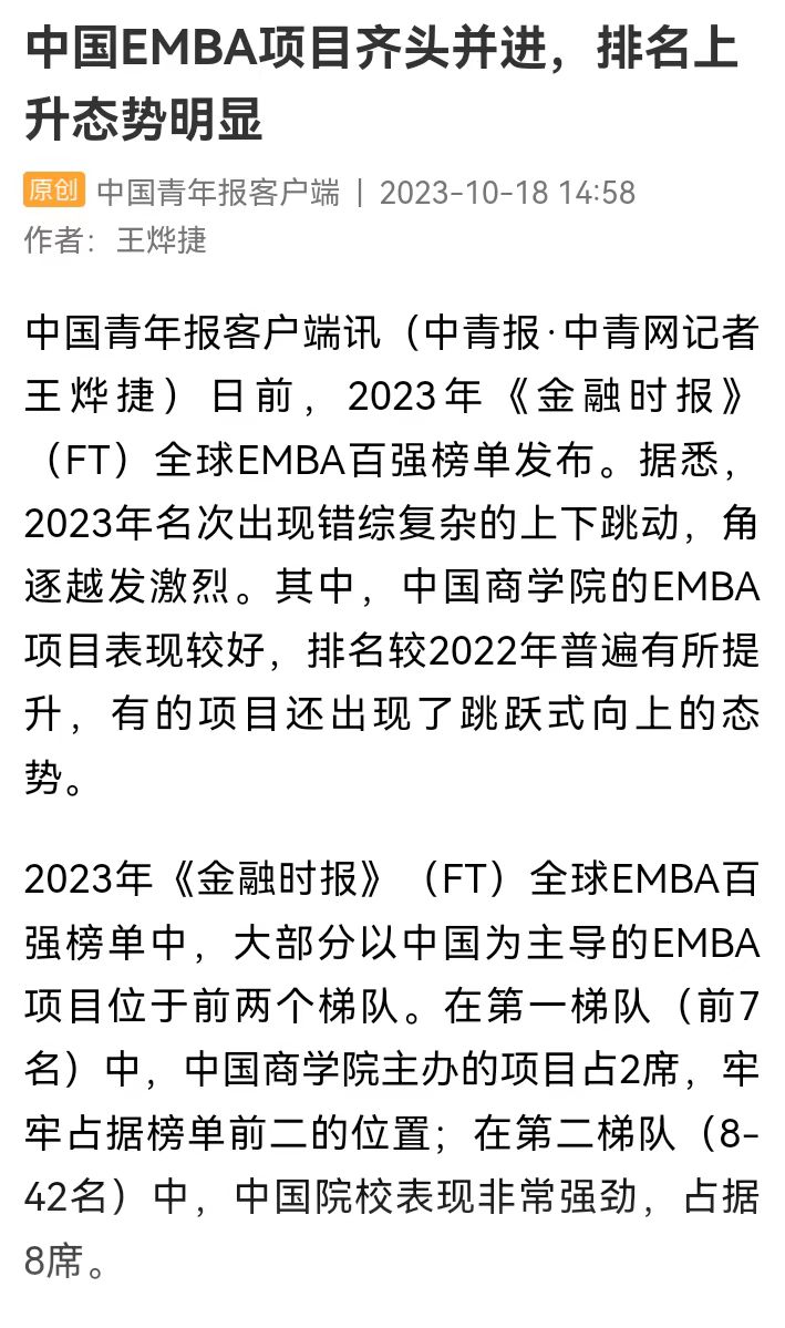 《中国青年报》:中国EMBA项目齐头并进,排名上升态势明显【2023年10月18日】