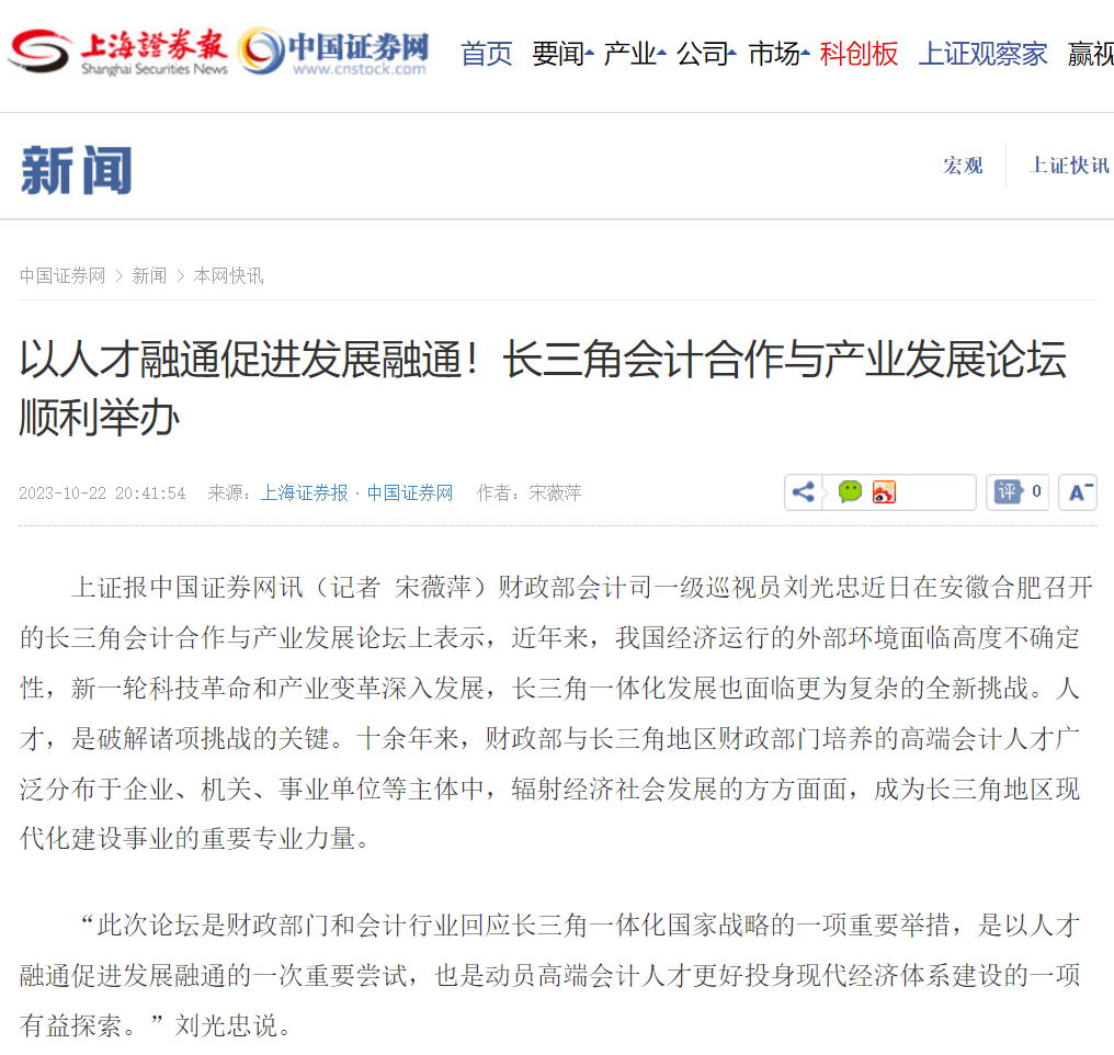 《上海证券报》:以人才融通促进发展融通!长三角会计合作与产业发展论坛顺利举办【2023年10月22日】