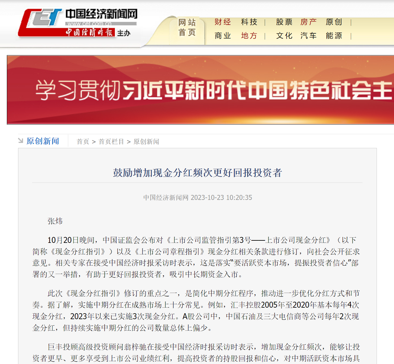 行业观点:叶小杰|《中国经济时报》:鼓励增加现金分红频次更好回报投资者【2023年10月23日】