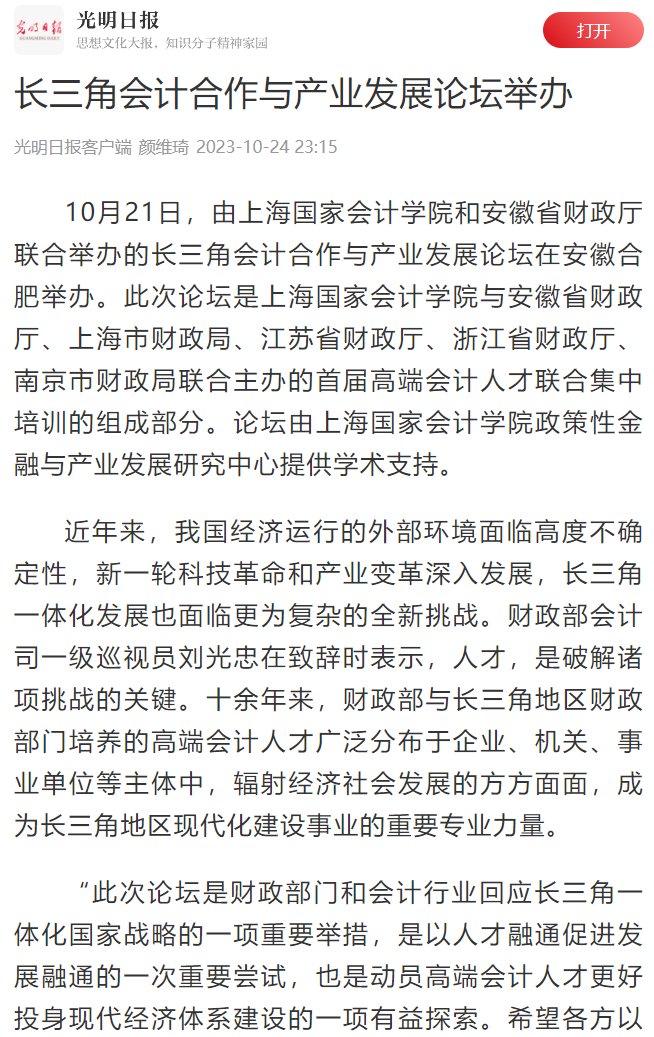 《光明日报》:长三角会计合作与产业发展论坛举办【2023年10月24日】