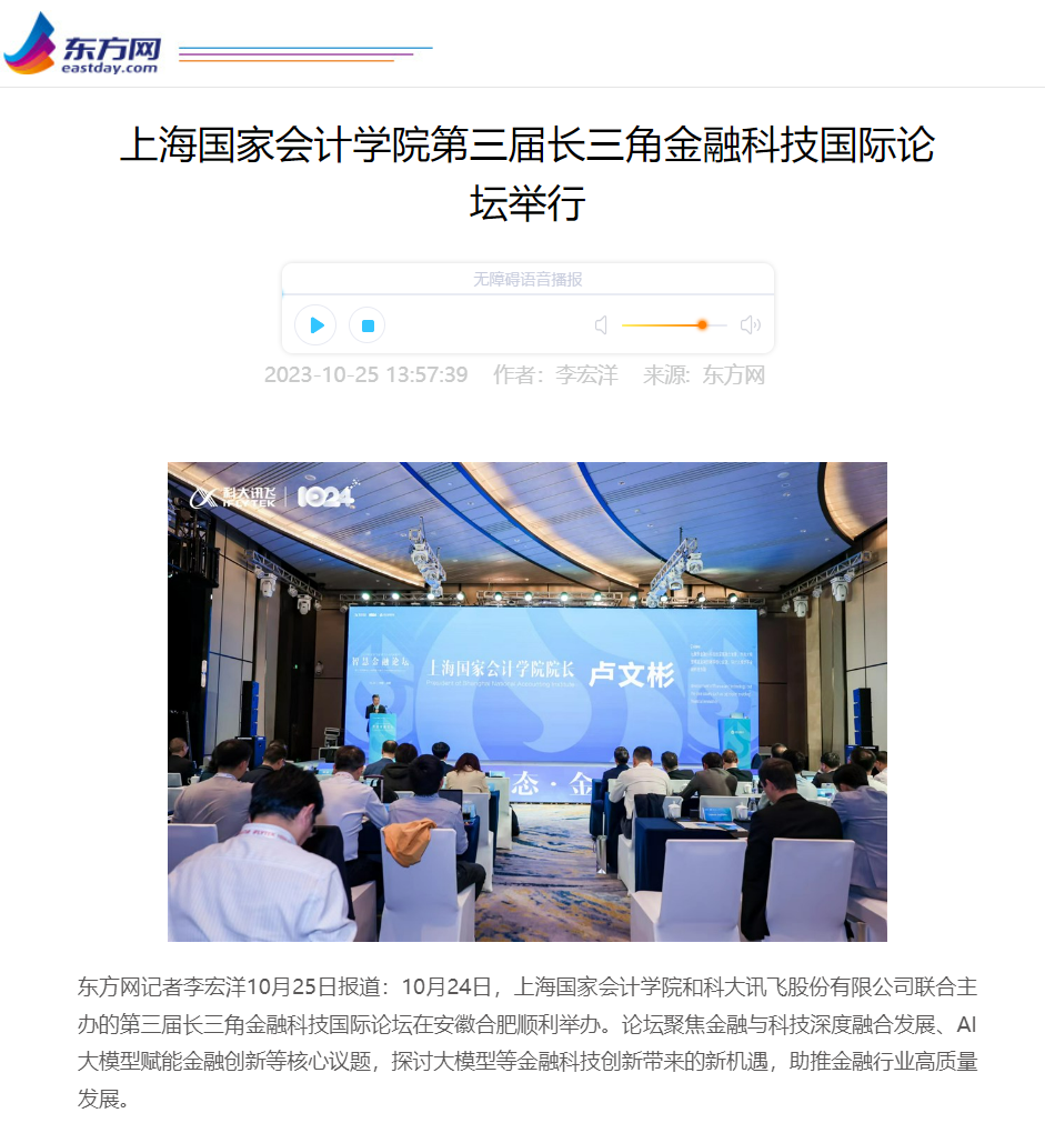 东方网:上海国家会计学院第三届长三角金融科技国际论坛举行【2023年10月25日】
