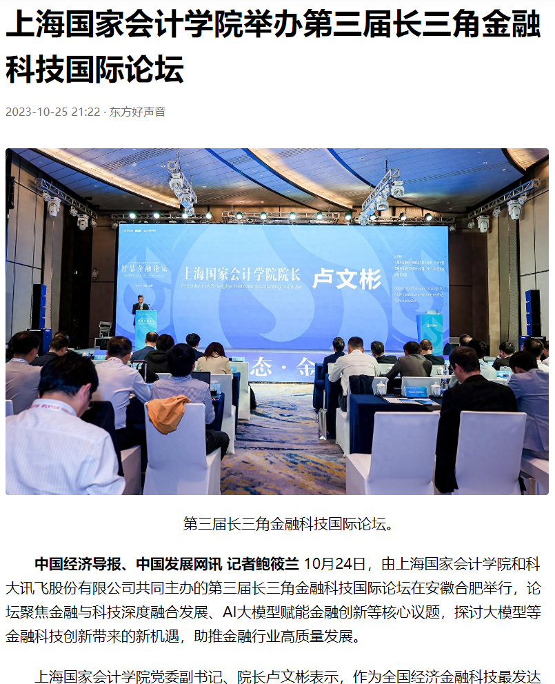 《中国经济导报》中国发展网:上海国家会计学院举办第三届长三角金融科技国际论坛【2023年10月25日】
