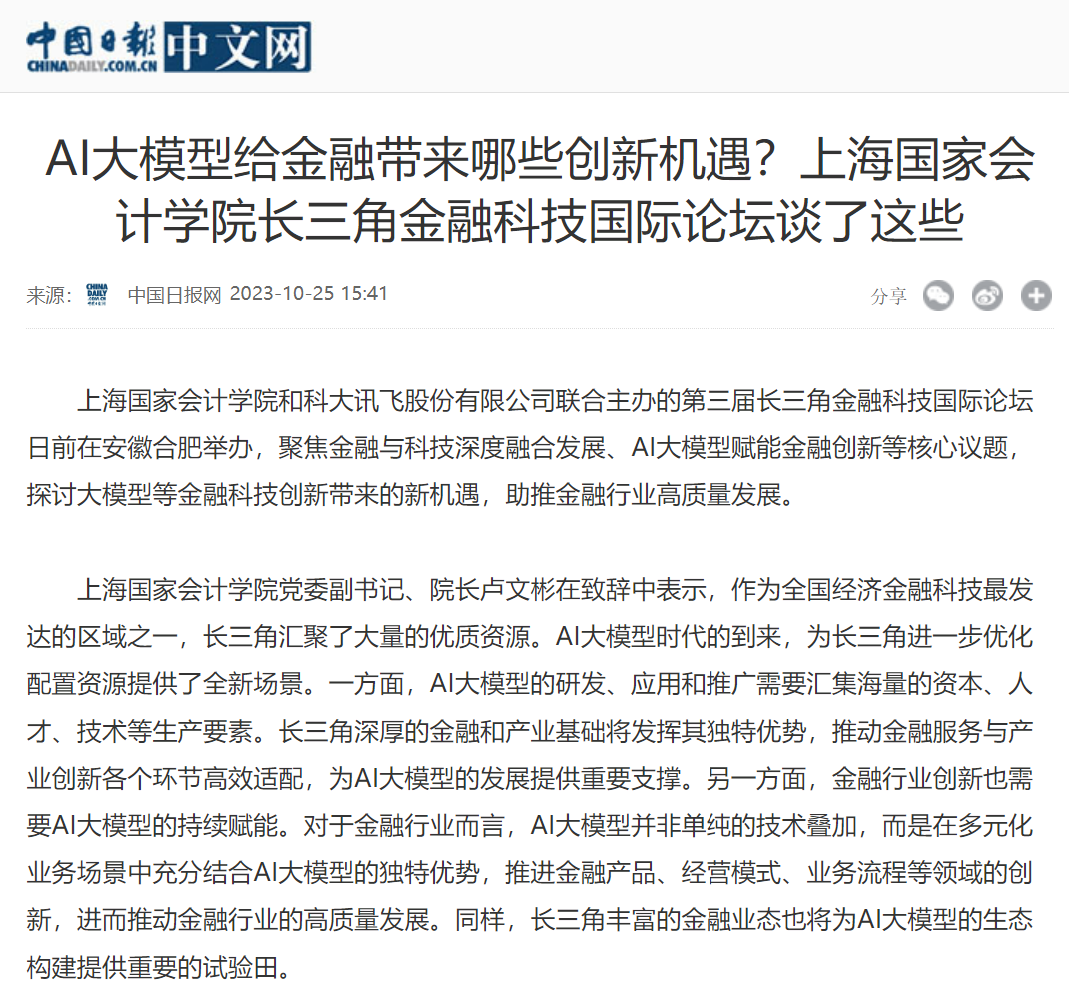 中国日报网:AI大模型给金融带来哪些创新机遇?上海国家会计学院长三角金融科技国际论坛谈了这些【2023年10月25日】