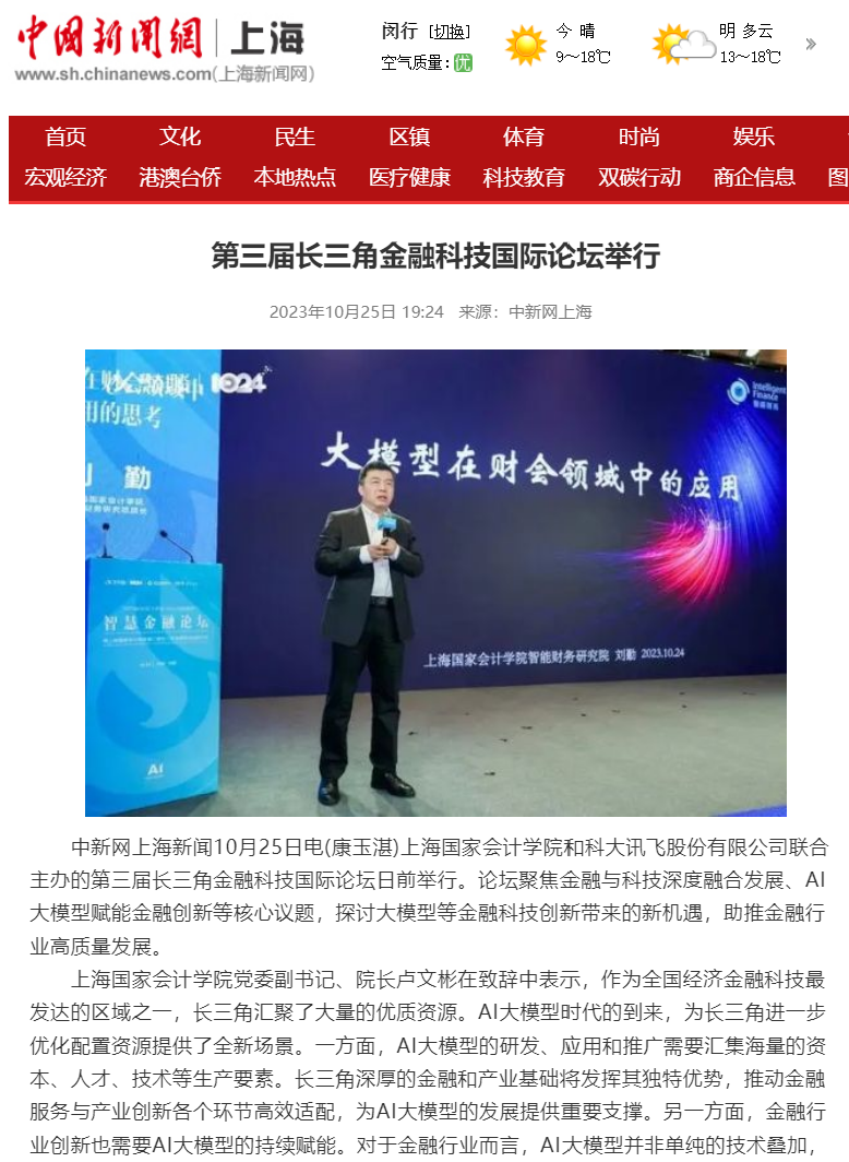 中新网上海新闻10月25日电(康玉湛)上海国家会计学院和科大讯飞股份有限公司联合主办的第三届长三角金融科技国际论坛日前举行。论坛聚焦金融与科技深度融合发展、AI大模型赋能金融创新等核心议题,探讨大模型等金融科技创新带来的新机遇,助推金融行业高质量发展。