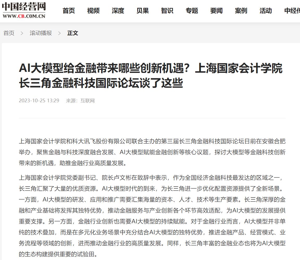 中国经营网:AI大模型给金融带来哪些创新机遇?上海国家会计学院长三角金融科技国际论坛谈了这些【2023年10月25日】