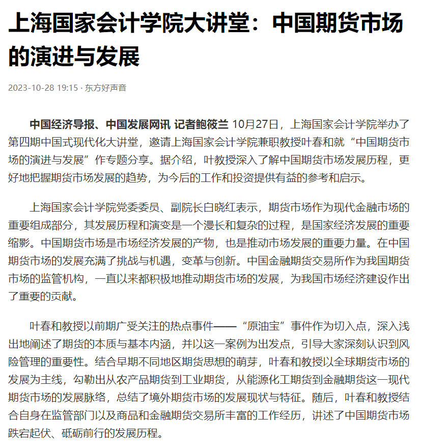 《中国经济导报》:上海国家会计学院大讲堂:中国期货市场的演进与发展 【2023年10月28日】
