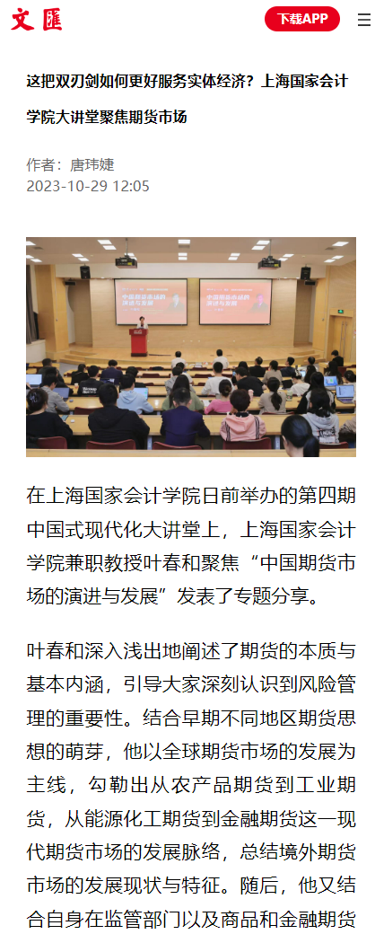 《文汇报》:这把双刃剑如何更好服务实体经济?上海国家会计学院大讲堂聚焦期货市场 【2023年10月29日】