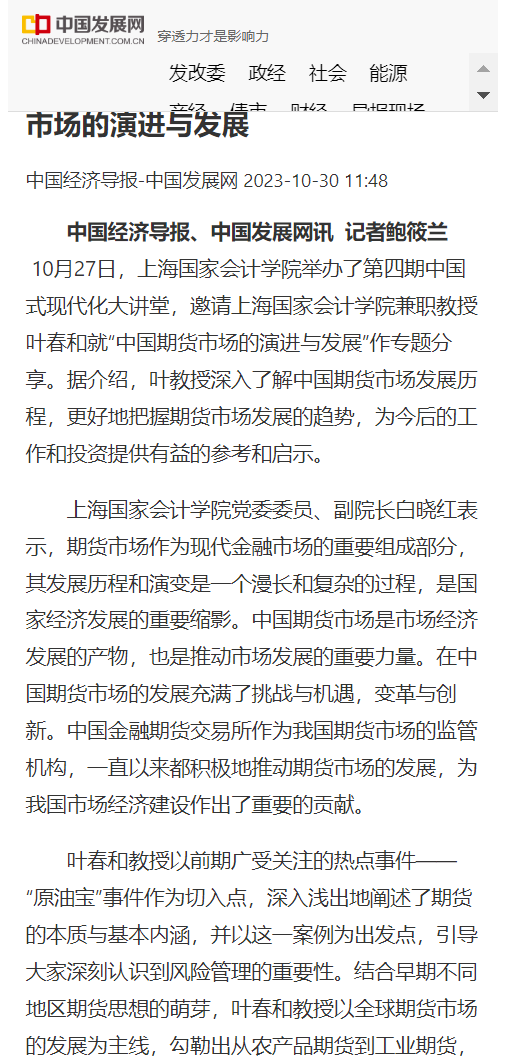 《中国经济导报》中国发展网:上海国家会计学院大讲堂:中国期货市场的演进与发展【2023年10月30日】