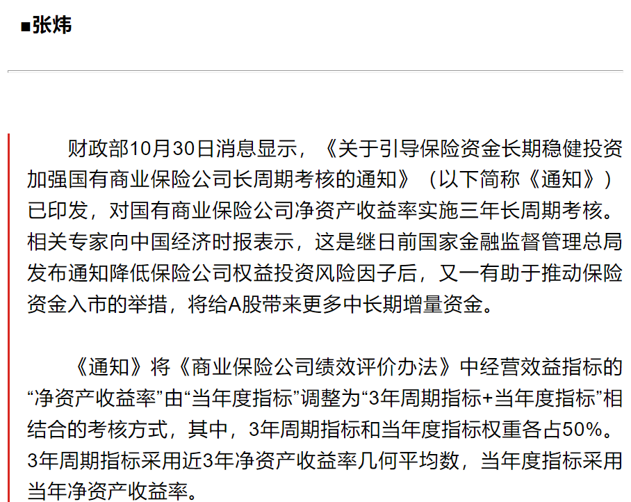 财政部10月30日消息显示,《关于引导保险资金长期稳健投资加强国有商业保险公司长周期考核的通知》(以下简称《通知》)已印发,对国有商业保险公司净资产收益率实施三年长周期考核。相关专家向中国经济时报表示,这是继日前国家金融监督管理总局发布通知降低保险公司权益投资风险因子后,又一有助于推动保险资金入市的举措,将给A股带来更多中长期增量资金。