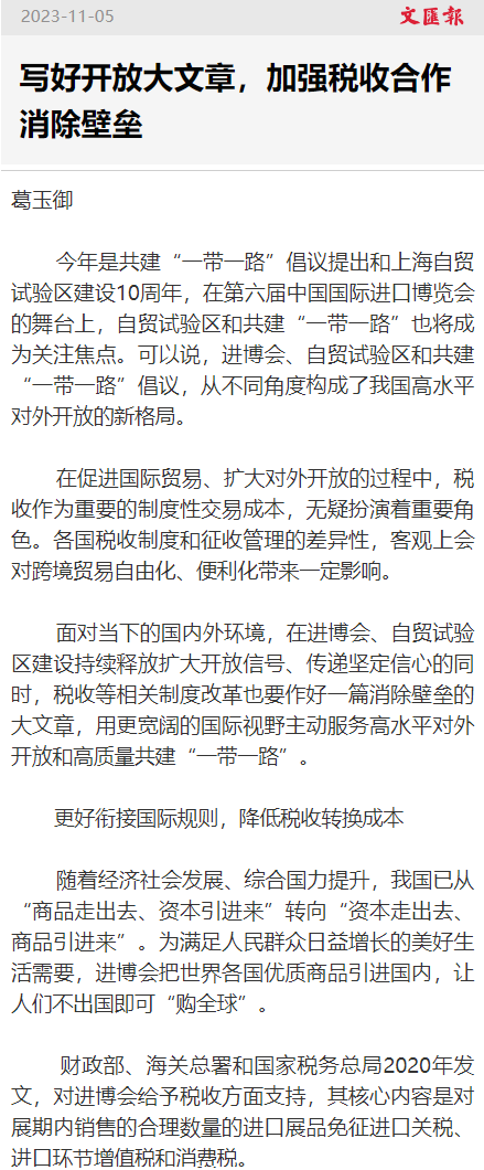 行业观点:葛玉御|《文汇报》:写好开放大文章,加强税收合作消除壁垒【2023年11月5日】