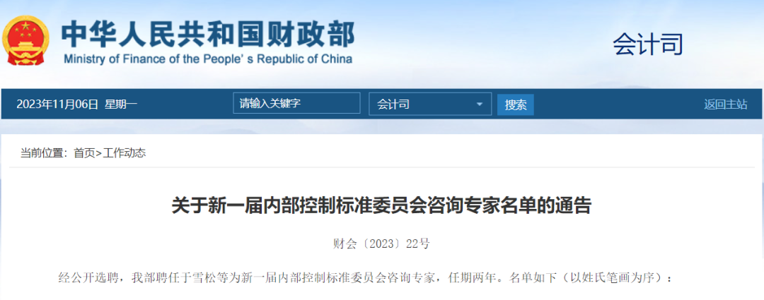 关于新一届内部控制标准委员会咨询专家名单的通告