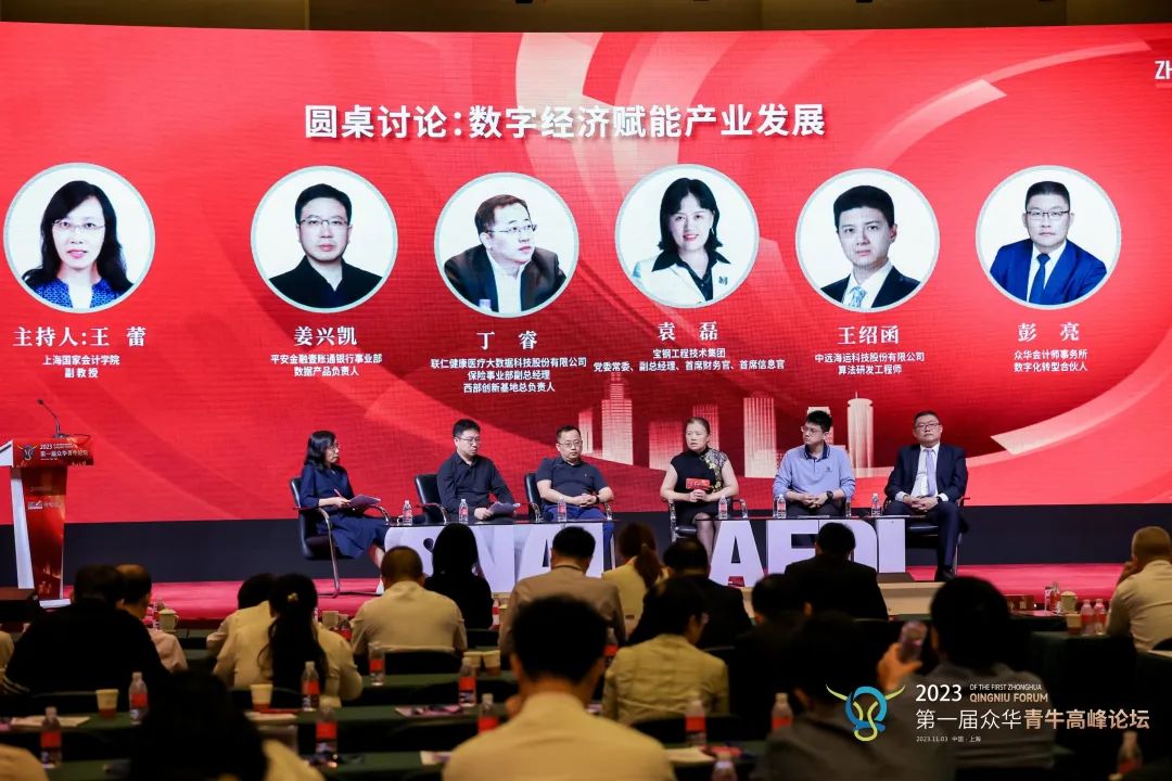 宝钢工程技术集团党委常委、副总经理、首席财务官、首席信息官袁磊、联仁健康医疗大数据科技股份有限公司保险事业部副总经理、西部创新基地总负责人丁睿、中远海运科技股份有限公司算法研发工程师王绍函、平安金融壹账通银行事业部数据产品负责人姜兴凯、众华会计师事务所信息化部主管合伙人彭亮围绕数字经济赋能产业发展的主题进行了圆桌讨论。