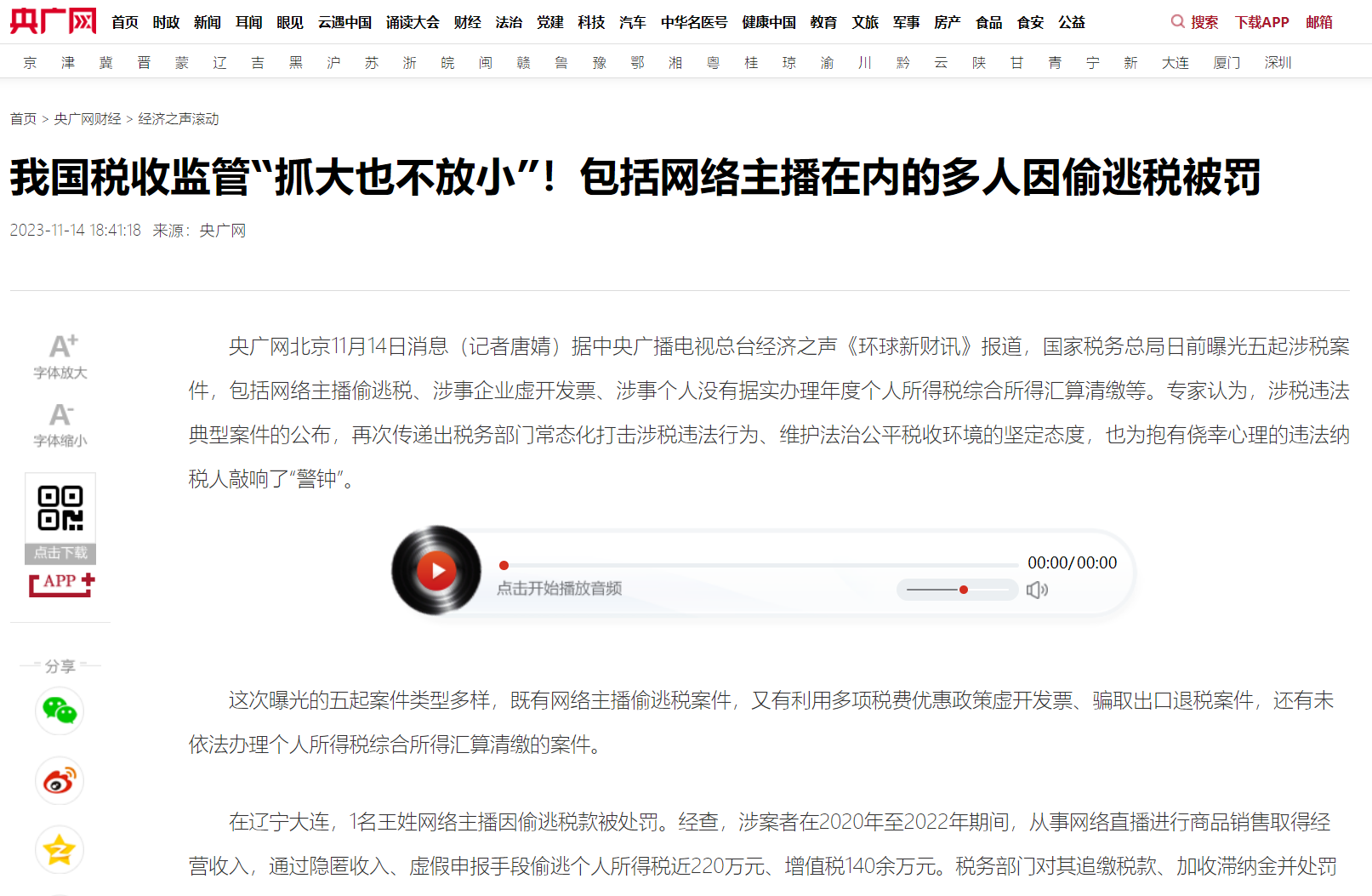 行业观点:葛玉御|央广网:我国税收监管“抓大也不放小”!包括网络主播在内的多人因偷逃税被罚【2023年11月14日】