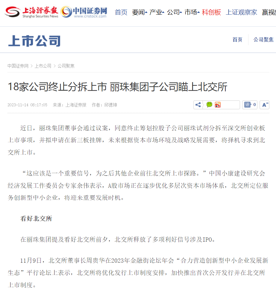 行业观点:叶小杰|《上海证券报》:18家公司终止分拆上市 丽珠集团子公司瞄上北交所【2023年11月14日】