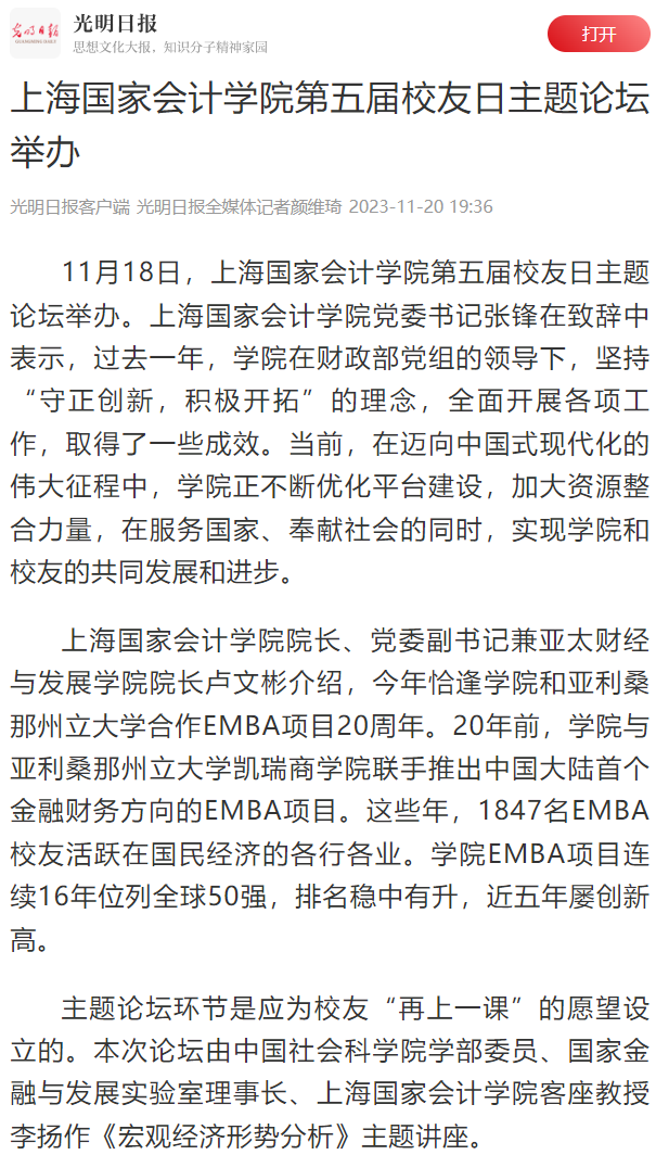 《光明日报》:上海国家会计学院第五届校友日主题论坛举办【2023年11月20日】