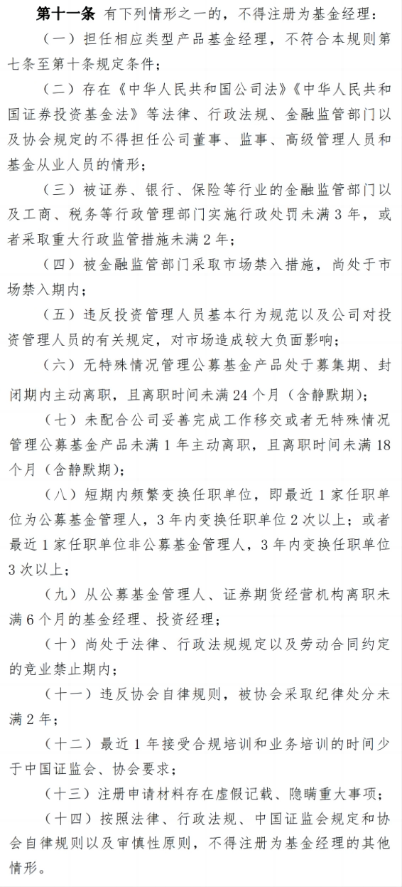 《注册登记规则》明确有下列情形之一的,不得注册为基金经理:无特殊情况管理公募基金产品处于募集期、封闭期内主动离职,且离职时间未满 24 个月(含静默期);未配合公司妥善完成工作移交或者无特殊情况管理公募基金产品未满 1 年主动离职,且离职时间未满 18个月(含静默期);短期内频繁变换任职单位,即最近 1 家任职单位为公募基金管理人,3 年内变换任职单位 2 次以上;或者最近 1 家任职单位非公募基金管理人,3 年内变换任职单位3 次以上;从公募基金管理人、证券期货经营机构离职未满 6 个月的基金经理、投资经理。