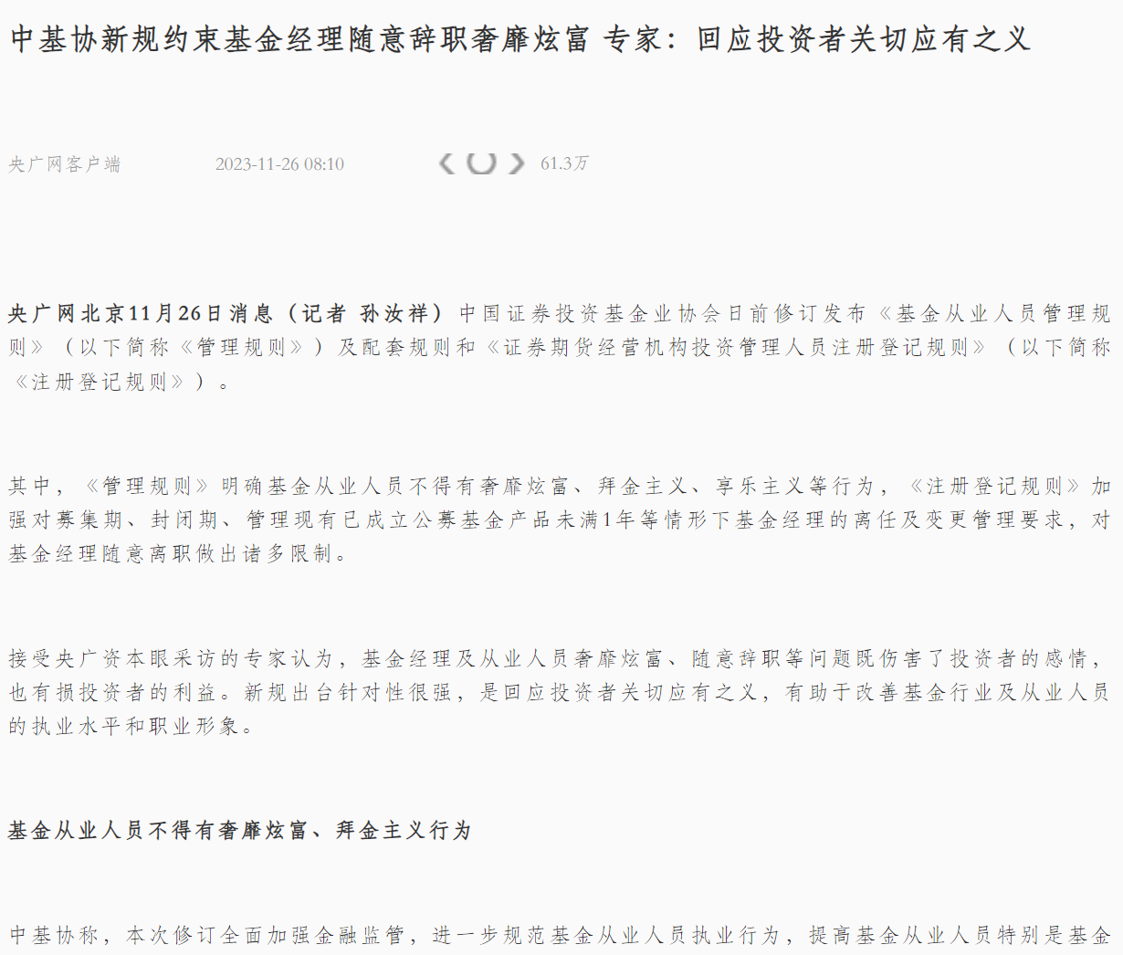行业观点:叶小杰|央广网:中基协新规约束基金经理随意辞职奢靡炫富 专家:回应投资者关切应有之义【2023年11月26日】