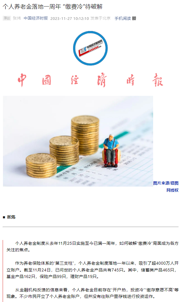 行业观点:叶小杰|《中国经济时报》:个人养老金落地一周年 “缴费冷”待破解【2023年11月27日】