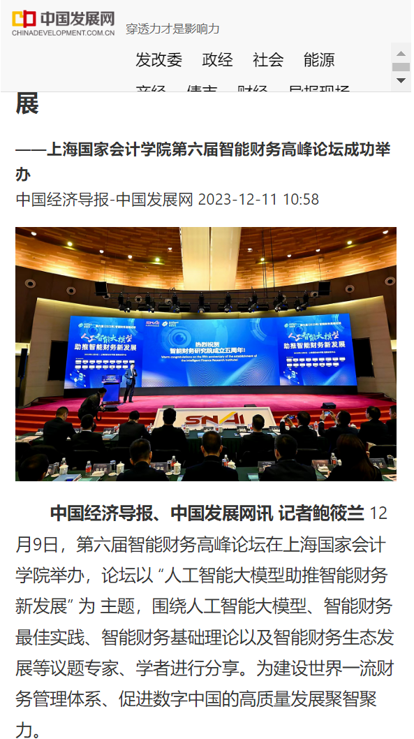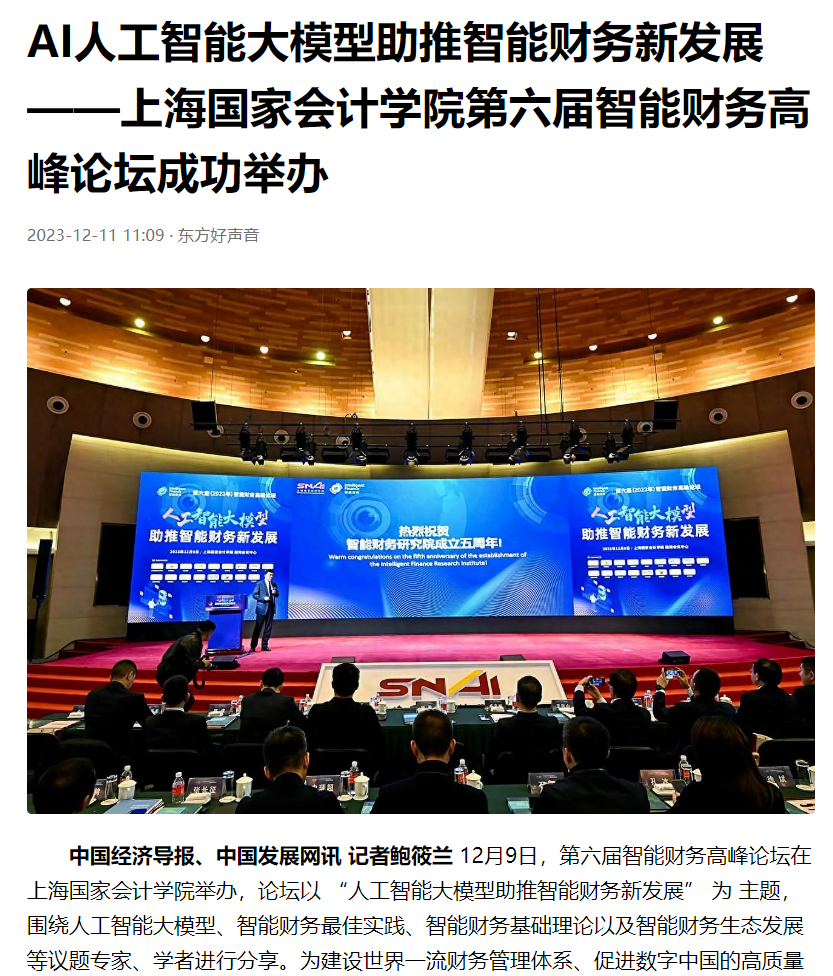 《中国经济导报》中国发展网:AI人工智能大模型助推智能财务新发展——上海国家会计学院第六届智能财务高峰论坛成功举办【2023年12月11日】