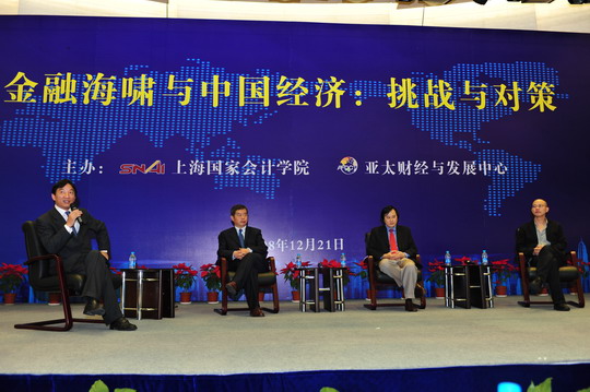 首先演讲的是中国社会科学院金融研究所所长李扬教授。李扬曾任央行货币政策委员会委员,作为中国金融领域著名的权威专家,他的声音一直响在金融研究和改革的最前沿,他以他的专业智慧和一腔热情时刻关注中国经济的发展,作为中国政府金融改革与发展的重要智囊,他以“金融危机及其对中国经济的影响”为题,发表了对于此次金融危机以及中国金融改革和发展问题的真知灼见,使得听众都深刻的体会到了他对中国金融改革和经济发展的期盼和责任感。