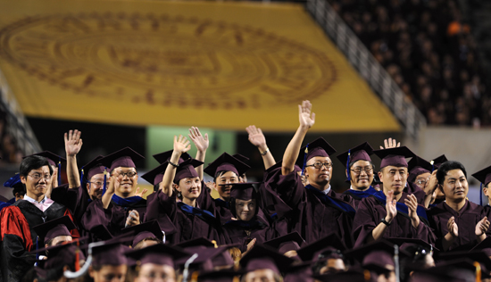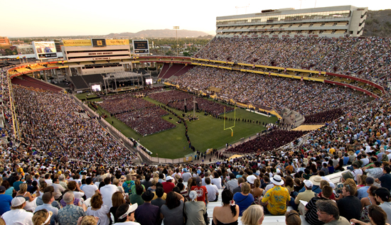 2009年亚利桑那州立大学(ASU)春季毕业典礼5月13日在美国凤凰城举行。该校博士、硕士研究生和本科毕业生8000余人和毕业生家属等共近7万人参加了典礼。我院与该校合作EMBA金融财务方向和现代服务管理方向的部分毕业生也远赴美国,参加了此次毕业典礼。美国总统巴拉克.奥巴马应邀在典礼上发表演讲。奥巴马勉励毕业生确立服务社会的人生目标,追求卓越。他说,不论人们目前做得多好,取得了多么大的成就,只要努力,总是能够做得更好。我院副院长李扣庆在访问世界银行后,应邀顺访了亚利桑那州立大学,并参加了毕业典礼。 |