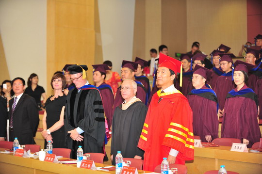 下午,在学院第三教学楼150人报告厅,在庄严的中美两国国歌声中,EMBA金融六期毕业典礼正式开始。典礼由项目中方主任李扣庆教授和美方项目主任贝克伟教授联袂主持。