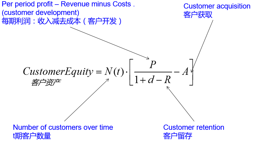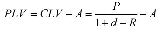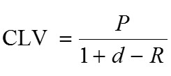 在衡量客户的盈利能力,进行客户关系管理决策时,客户终身价值(Customer Lifetime Value,CLV)是首选工具。客户终身价值强调的是未来的盈利能力,谁才是真正的客户、时间跨度、每期利润(收入和成本)、贴现率、留存率、客户获取成本……这些因素共同决定了客户终身价值的大小。假定长期的固定收益为P,固定留存率为R,贴现率为d,时期为t,那么长期来看,客户终身价值和预期终身价值(PLV)可以下面的简便方式求得: