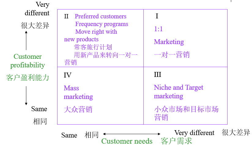 诚然,不是每个企业都适合面向每个客户去管理,这正是市场细分的必要性所在。要实现对个体层面的客户“一对一”的营销管理,首先要客户具备差异化的特征,这包括客户给企业带来的价值有差异,以及客户需求有差异;其次要企业具备与客户灵活沟通的能力,以及生产、物流方面的灵活性(为大规模定制奠定基础),如此才能将客户关系管理的优势发挥到最大程度。如下图中的四个象限,以行业来举例可见,像加油站之类的企业,只适合大众营销;像航空公司、移动通信公司等企业,客户需求类似但盈利能力差异大,更适合常客计划或推出新产品;像时装店、书店等企业则相反,客户的盈利能力很接近,但需求差异大,比较适合针对利基市场(小众市场)确定营销策略;像电脑系统、药店、宾馆等企业,客户的盈利能力和需求差异都很大,才最适合采用“一对一”的营销。