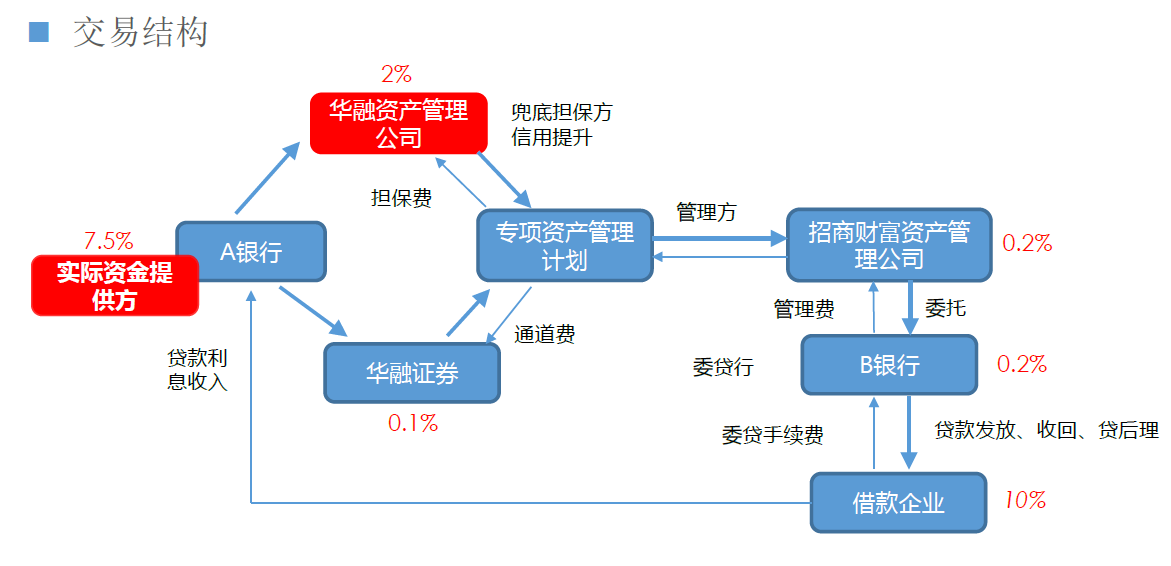 借款人向A银行提出2亿人民币贷款需求,期限12个月,双方议定好资金价格。为规避监管,A银行委托华融资产管理公司、华融证券成立专项资产管理计划投资于该信贷资产,由招商财富资产管理有限公司进行管理。资管计划委托B银行向借款人发放贷款。