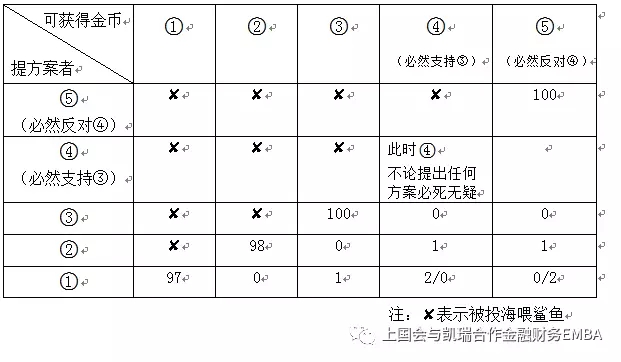 为了让学员们尝试在有限重复博弈中自行逆向归纳,夏教授请了五位学员上台做了一个“海盗分金币”的游戏。5个海盗劫船抢得100枚金币,他们按抽签的顺序(将海盗编为1号、2号、3号、4号和5号)依次提方案:首先由1号提出分配方案,然后5人表决,包括自己在内超过半数同意方案通过,否则他将被扔入大海喂鲨鱼,依此类推。学员们普遍认为,顺序为先的海盗不具优势,尤其1号海盗简直是必死无疑,认为提出的方案自己少拿甚至不拿金币才有可能保命。当夏院长揭开谜底时,1号海盗出乎意料地是最具先发优势的人,他不但可以消除死亡威胁,还可以成为收益最大的赢家。