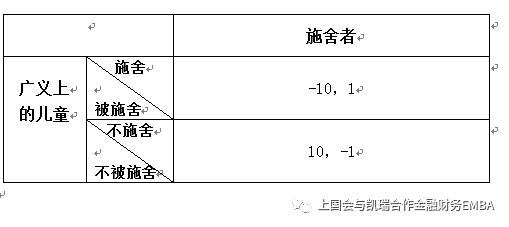 针对这一问题,第五组的学员给出了他们的答案。小组代表坦言,在讨论过程中大家是有不同看法的。但大多数成员在回答这个问题时会考虑两个维度——施舍者在施舍后都得到了良心安慰(+1),反之,不施舍则受到良心谴责(-1);广义上的儿童(并不是指被施舍的儿童而是指对儿童这个整体),假设这些乞讨的儿童绝大多数不是天生残疾而是犯罪机构使他们后天致残以求得利益的一种变态商业行为,那么在获得施舍的情况下,广义上的儿童受到的是一种巨大的负面效应,相应的会打出绝对值非常大的负分(-10),反之不施舍则会抑制这种变态而不人道的商业行为(10)。所以,基于以上得出的最优反应是不施舍。