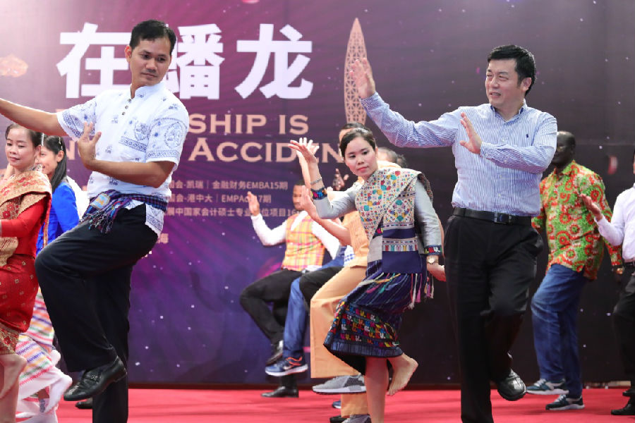 17级留学生表演《东南亚风情舞》,异国情调,尽情绽放;他们步入会场,顿时全场变成了欢舞的海洋。两位院长也参与其中。