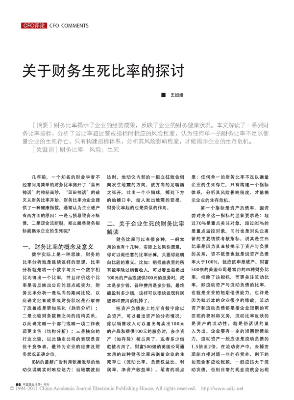 EMPAcc十二期学员王团维撰写的《关于财务生死比率的探讨》一文刊登在《中国总会计师》2011.2,该文章同时获山西总会计师协会一等奖。为了便于大家学习,特转载如下:
