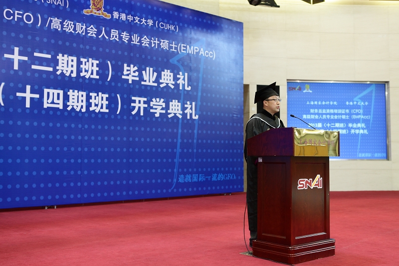 在隆重的颁证仪式之后,EMPAcc十二期班长苑鼎宏同学代表毕业生发表了深情感言。他总结了两年辛苦的学习生活,虽然辛苦,但收获颇丰。他代表全班同学感谢各位老师的倾情付出,为各位同学插上了腾飞的翅膀;感恩学员之间的无私交流和关怀互助。誓言每一位学员必将带着智慧、带着感恩,为所在企业、为社会做出贡献,实现人生理想。EMPAcc十四期陈战宇同学代表新生做了简要的发言,并表达了努力学习、激荡思想、分享智慧,努力将所学应用于企业的实践,为社会做更大贡献的决心。