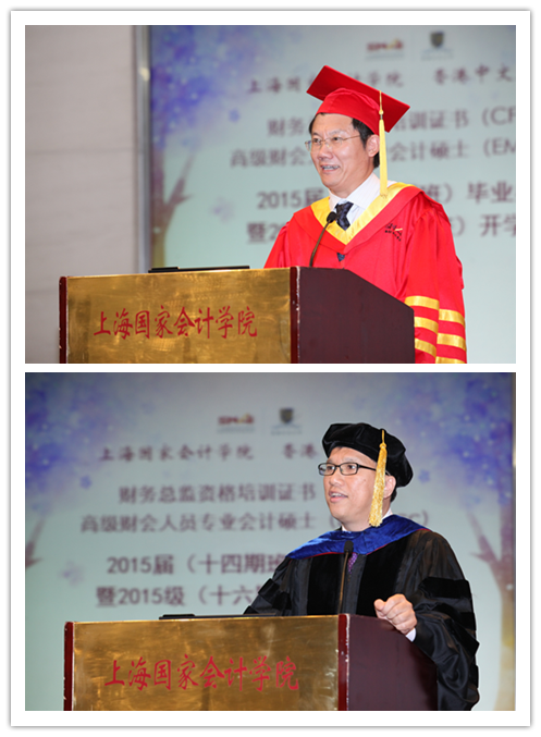 李院长代表上海国家会计学院的全体员工表达了对十四期毕业生的真挚祝贺和对十六期新生的热烈欢迎。会上李院长介绍了EMPAcc项目的历史以及与香港中文大学的合作渊源,对两校多年来的精诚协作表示由衷的感谢。同时寄语各位校友,面对世界快速的变化,一定要经营、管理好自己的心灵花园和知识仓库。
