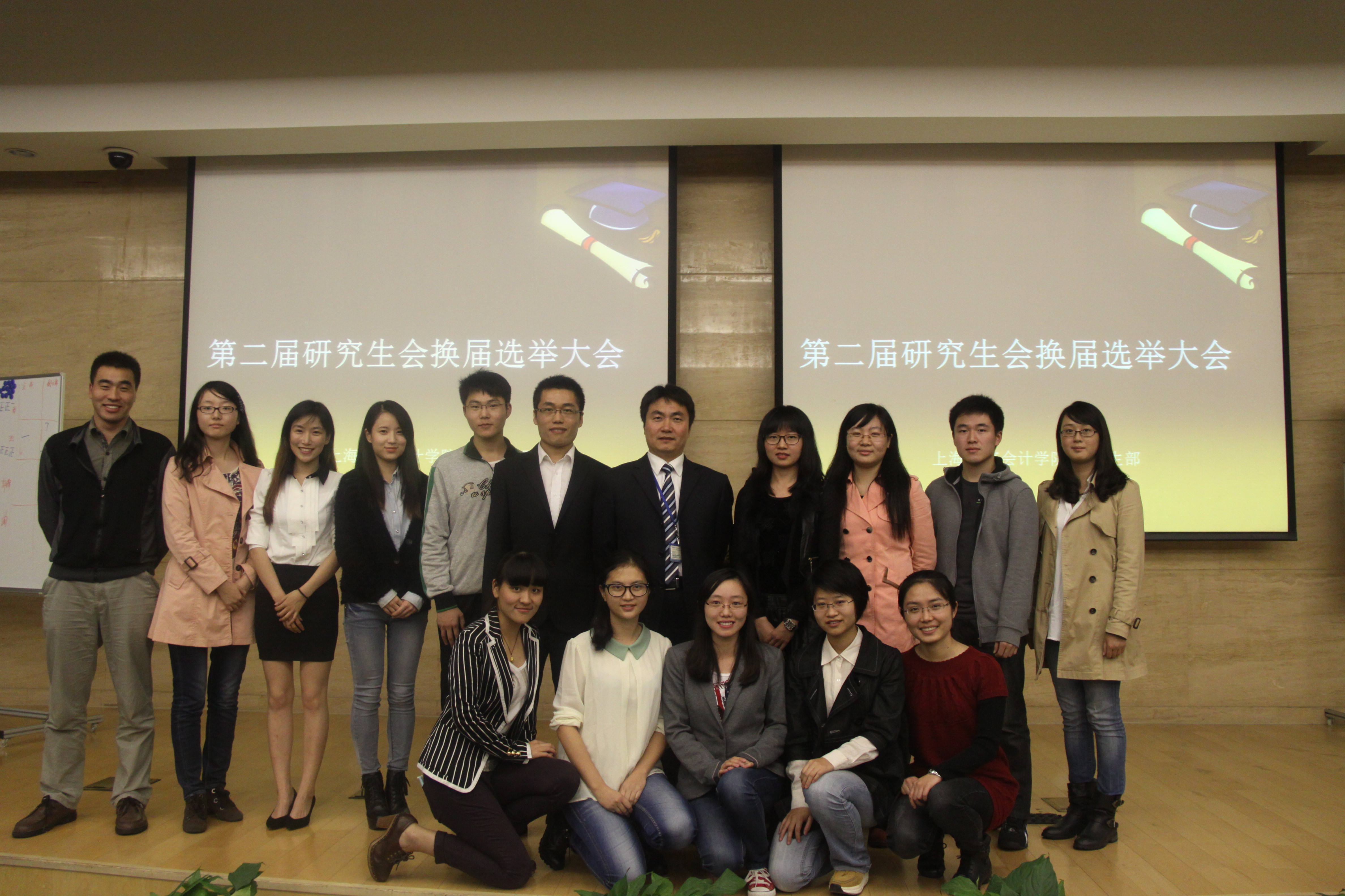(撰稿/2013级会计二班周文洁 摄影/赵云燕 刘荣光)2013年11月8日晚,上海国家会计学院第二届研究生会换届选举大会在三教150人报告厅举行,信息与远程教育部秦燕军主任,后勤部易宏勋主任,党办薛许红老师,研究生部颜延主任,研究生部肖舒羽老师出席此次换届选举大会,并担任评委老师,大会由研究生会副主席盛梦迪同学主持,2013级全体研究生和部分2012级研会干事参加了此次换届选举。