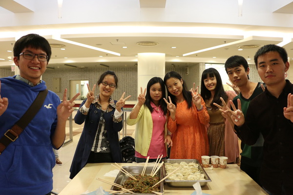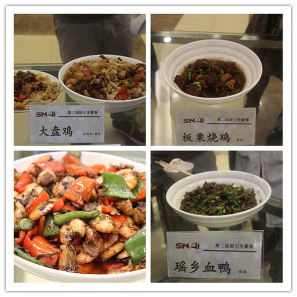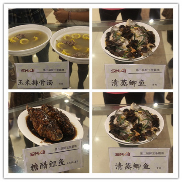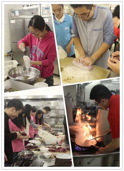 本次大赛分为厨艺比拼和包饺子活动两个环节,来自2014级研究生的26道菜肴分为A、B两组进行厨艺比拼。选手们在后厨精神饱满,用他们娴熟的刀工、精湛的厨艺做出了一道道的美味佳肴,这其中包括糖醋鲤鱼、培根虾仁卷、椒杭牛柳、瑶乡血鸭、新疆大盘鸡、叔叔家的鱼、枣核肉等特色美食,也有双皮奶、蛋挞、沙拉等精美甜点,无论是味道还是外观,都让在场的评委和同学们赞叹不已。当参赛选手一个个在后厨大展厨艺的时候,前台的食客同学们也是忙的不可开交。他们分为十多个小组,正在进行了包饺子活动。一个个饺子皮在他们的手中翻转,一个个琳珑剔透的饺子便应运而生,1500个饺子在不到半个小时之内就全部完成。