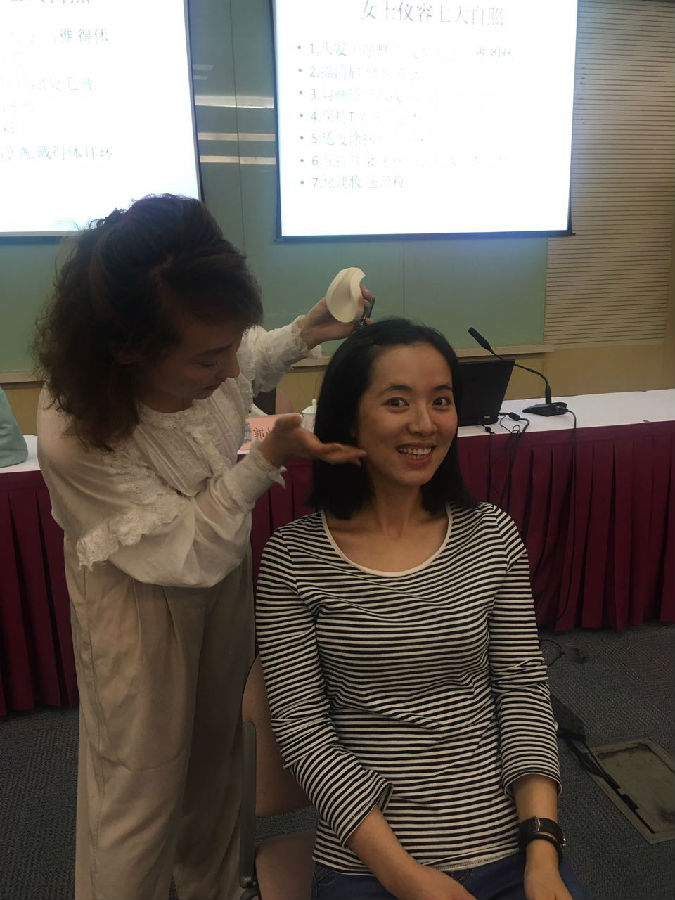 这次的讲座郭老师主要围绕职业妆容、服饰搭配、配饰的使用,三方面内容展开,重点谈到面试中应从妆容、服饰的色彩搭配、发型、鞋子、适当的装饰等方面注意形象装饰的细节。并为大家现场演示了塑造精致妆面的完整流程,教会大家丝巾使用及搭配方式。同学们认真地看着老师的演示,在实战阶段积极练习,学会了职场形象设计小技巧。