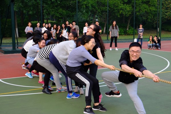 当天傍晚,首先在篮球场举办了本次运动会的第一项户外活动——拔河比赛。这项活动同学们的参与度最高,要求每个班派出10余名同学,十分考验团队精神和班级凝聚力。各班代表队都展现出最强的比赛阵容,齐心协力,勇争第一。当比赛的哨声响起,参赛的队员们紧握长绳,铆足了劲奋力后拉,未参赛的同学自发组成啦啦队为比赛的队员加油,哨子声、呐喊声此起彼伏,激烈的比拼将本次趣味运动会推向了第一个高潮,也让每一位同学迸发出强烈的集体荣誉感。最后税务班以不容小觑的实力获得了第一名。