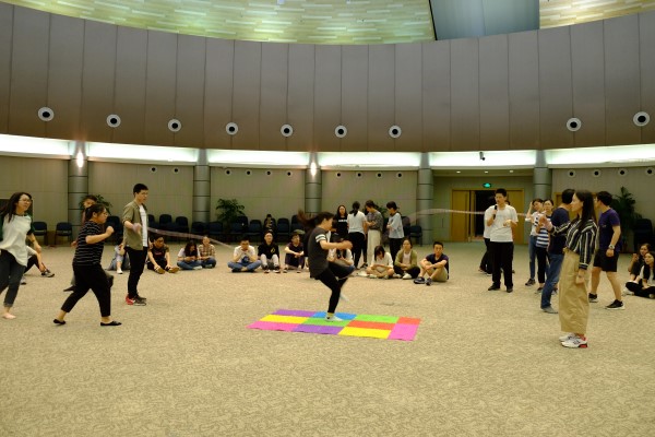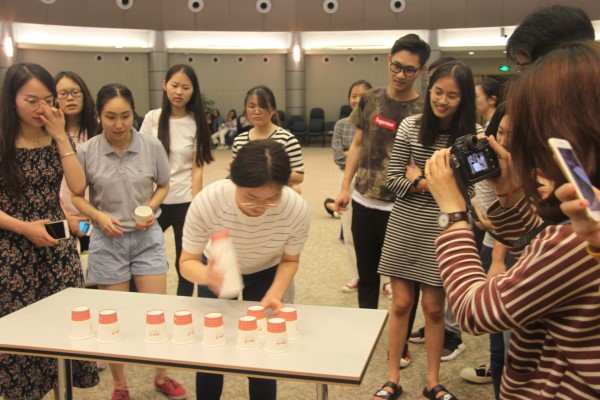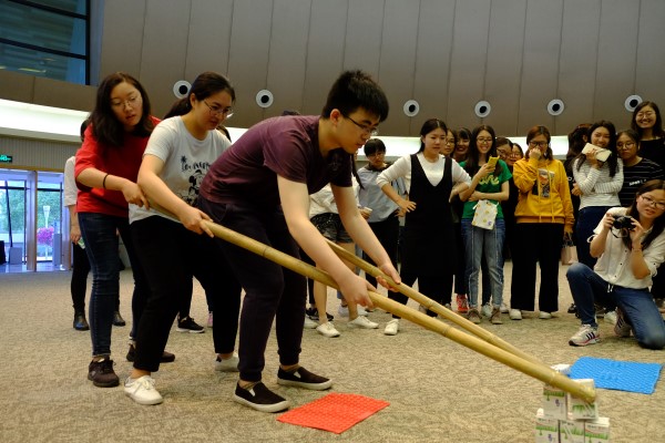 源于综艺节目的指压板跳长绳活动为同学们带来了一场视觉盛宴。一面怜惜着参赛选手们落地时的疼痛,一面又惊叹于选手们轻盈的身姿,彼此间默契的配合又一次展现了各班的团队凝聚力。最后一项活动是杯子游戏,此时大家都略感疲惫,但依然斗志昂扬,为班级而战。