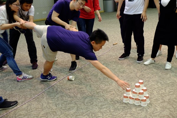 第三项活动是隔空取物,在这一轮手长而又兼具柔韧性的女生非常具有优势。虽然会计二班男生不多,但巾帼不让须眉,在这一场比赛中作出了巨大贡献。值得一提的是因为需要由队友拉住参赛者的手脚,因而彼此间的信任十分重要。本着安全第一的主旨,往往是队友们紧紧拉住选手,而选手呼喊着“松一点,再松一点”以拿到远处的物品,趣味横生,却也同时彰显着同窗情谊。