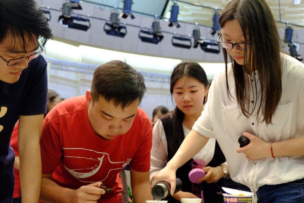 之后,同学们意犹未尽,成群结队地赶往国际会议中心参加接下来的活动项目。第二项活动是夹牛奶,由上轮比赛的第一名税务班率先出场,凭借着沉着冷静的姿态,参赛选手不慌不忙,在一分钟内顺利完成了任务。接下来出场的会计一班派出了三名女将,虽然不如个高的男生有优势,但依靠着不气馁的精神,即使屡屡受挫也丝毫未影响气势,赢得了场下同学的阵阵掌声。之后上场的两班同学都选择了更为高大的男生参赛,选手们专心致志地注视着牛奶瓶,不受外界的任何干扰,均出色地完成了比赛。