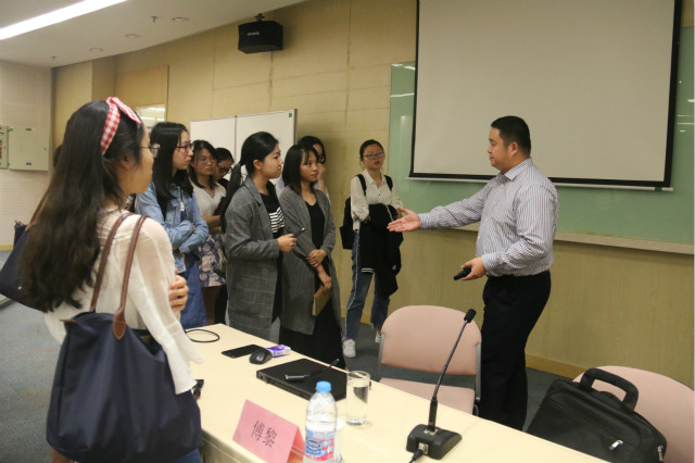 接着,傅老师从求职的流程出发,为大家介绍各个节点应当注意的事项:首先要在心理上和行动上适应从学生到社会人这一角色的转变,在简历的准备上多下功夫。傅老师以几份简历为例,与大家分享了他作为招聘官对于简历撰写的心得体会。在面试的具体细节上,老师介绍了着装、礼仪等方面的注意事项,并对几种主要的面试形式做了介绍,傅老师还与在场同学们分享了面试时的STAR法则,即situation、task、action及result.傅老师强调,面试时最重要的是Be yourelf,真实地表现自己不代表不做准备,而是在与面试官沟通时诚实地展现自己的情况,以真诚和能力取胜。