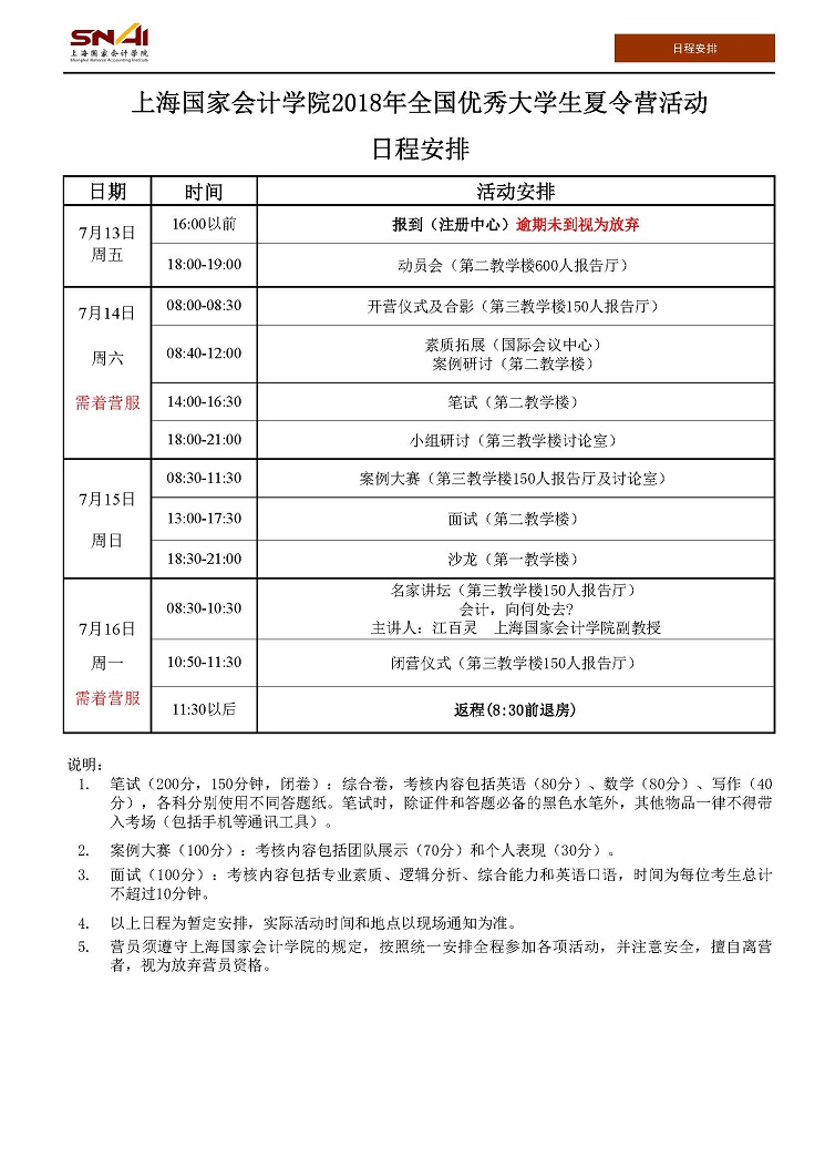 上海国家会计学院2018年全国优秀大学生夏令营活动日程安排
