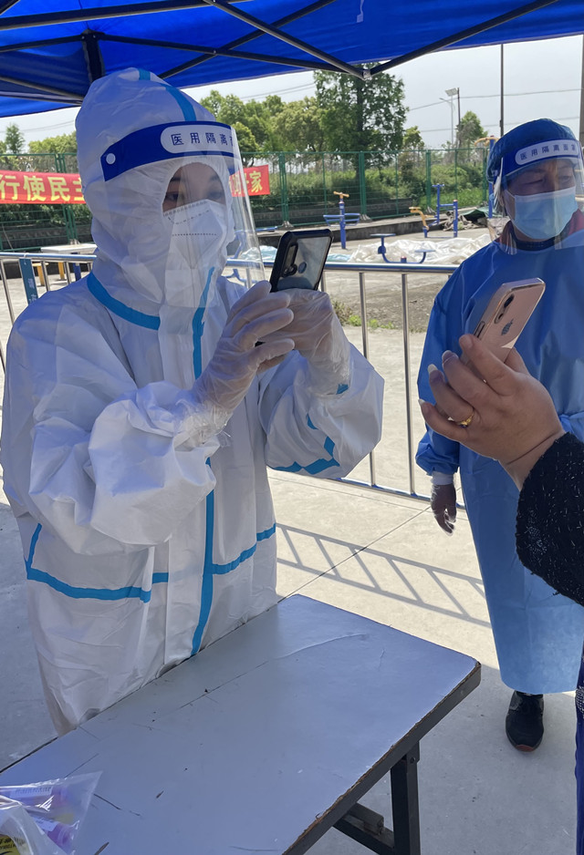 郑艺记得,自己负责为金泽镇保供人员核算检测扫码那天恰逢狂风暴雨,马路边的香樟树都被吹掉了许多树枝。因为两个棚之间衔接处漏雨,她的防护面罩被雨水打湿,眼前一片模糊,她每扫一次码就得用纸巾擦一次。这期间医生所在的棚子被大风刮倒,她以为现场会出现混乱,但无论是排队的人还是工作人员都没有慌乱,排队的居民安静地站在雨中,她和临近的工作人员就像听到了无声的指令默默地快速搭好棚子,让核酸检测迅速恢复正常。
