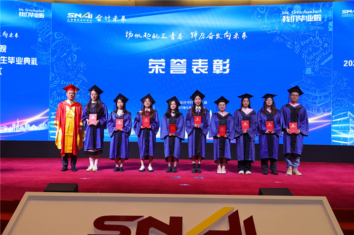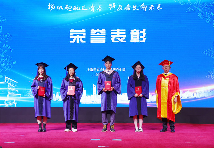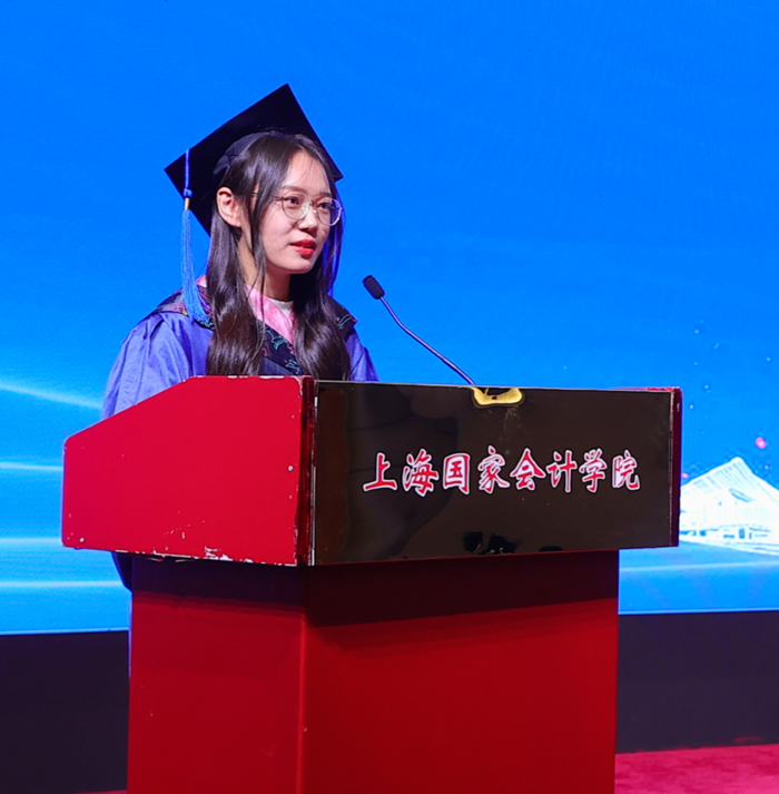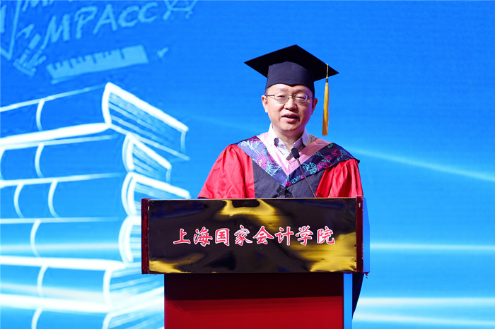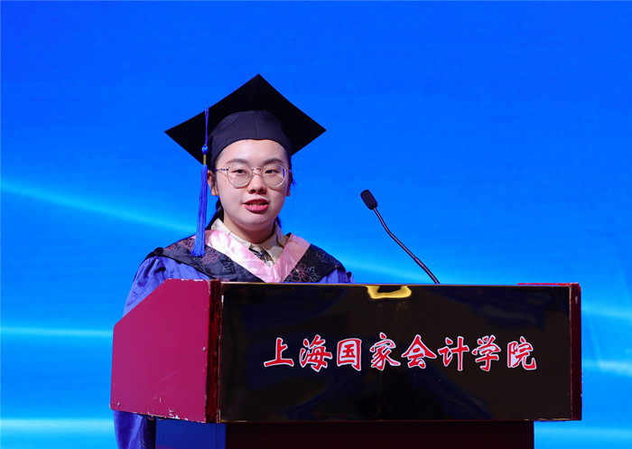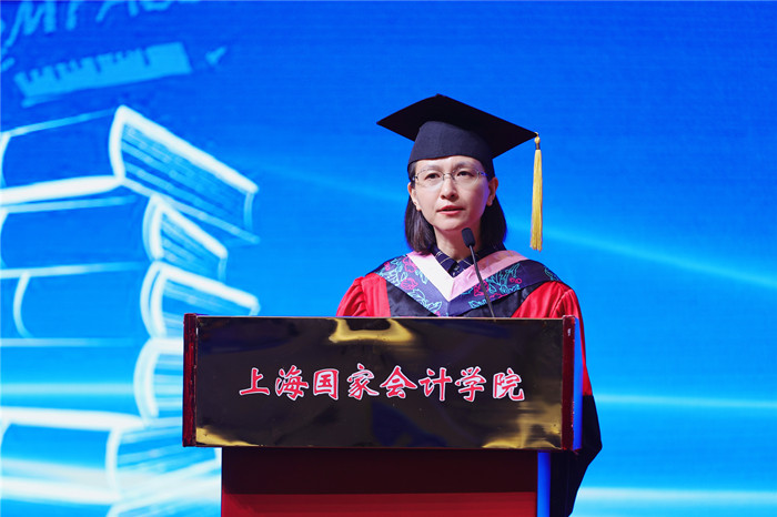 典礼上,郑德渊主任宣读了《上海国家会计学院学位评定委员会决议》,张锋书记与卢文彬院长为毕业生授予学位,并为获评国家奖学金、优秀毕业生、优秀学位论文的毕业生及获评优秀论文指导教师荣誉的教师代表进行了表彰。卢文彬院长为EMBA金融十二期、EMPAcc三期校友代表赠送了毕业生论文集,答谢校友们对研究生培养工作的支持。施佳豆和於铃分别代表非全日制、全日制毕业生发言。典礼最后,卢院长为毕业生代表赠送了校友卡。