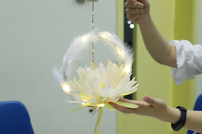各个小组充分发挥创造力,亲手制作各式各样的花灯,从经典的红灯笼到独特的创意手工灯,每一个作品都独具个性和文化底蕴。一盏盏花灯发出盈盈夜光,为中秋的夜晚增添了绚丽的色彩,营造了浓浓的节日气氛。