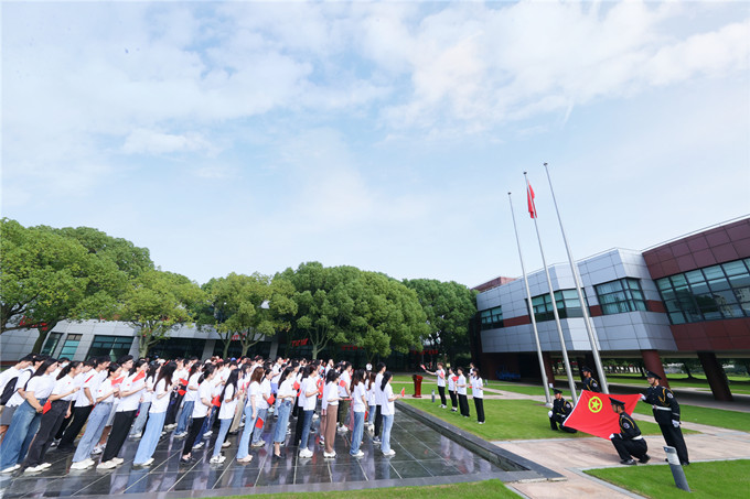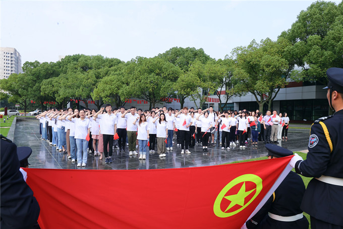 上午8时25分,在嘹亮的出旗号角中,旗手们昂首挺胸,步伐铿锵有力,护卫国旗走向升旗台。伴随着《义勇军进行曲》的雄壮旋律,鲜艳的五星红旗冉冉升起,全体人员向国旗行注目礼,共唱国歌。