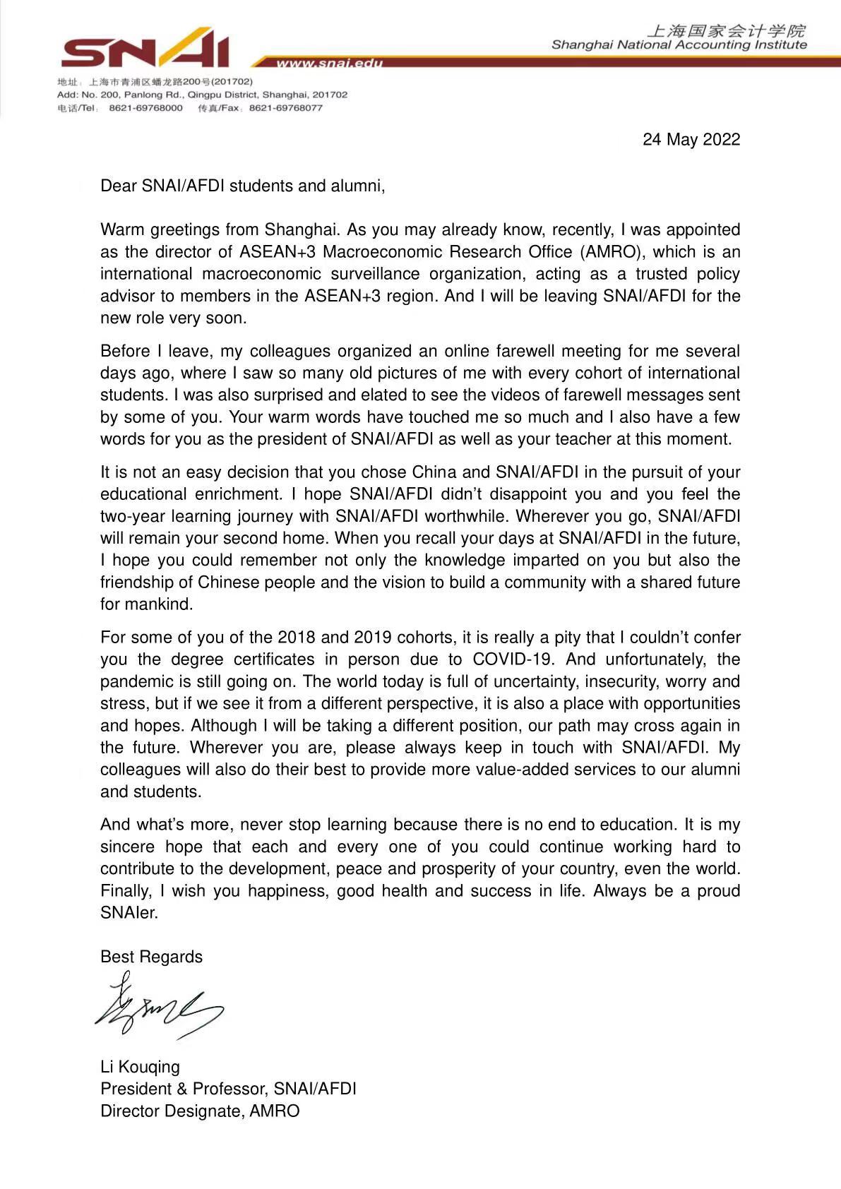 Letter to SNAI students and alumni from Dr. Li Kouqing